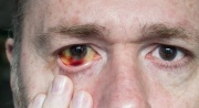 (Figure 1 shows a subconjunctival hemorrhage, caused by bleeding beneath the clear skin covering the white of the eye. These vivid bruises often accompany the bruising of a black eye, but can also occur spontaneously.)